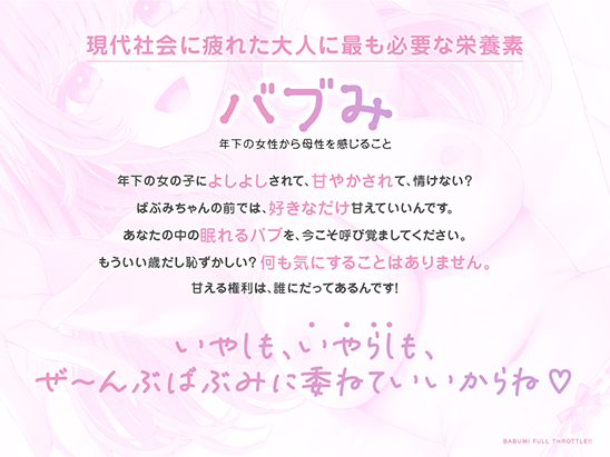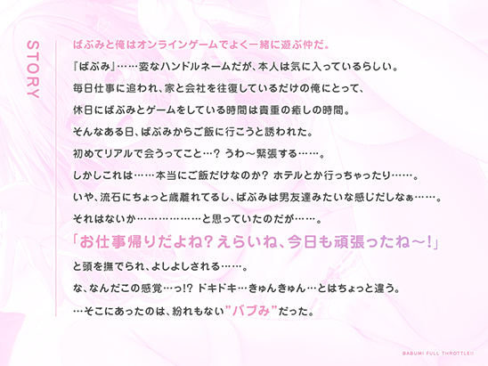 紹介文 ■ストーリー ばぶみと俺はオンラインゲームでよく一緒に遊ぶ仲だ。 「ばぶみ」…変なハンドルネームだが、本人は気に入ってるらしい。 毎日仕事に追われ、家と会社を往復しているだけの俺にとって、 休日にばぶみとゲームをしている時間は貴重の癒しの時間。 そんなある日、ばぶみからご飯に行こうと誘われた。 初めてリアルで会うってこと…?うわ~緊張する……。 しかしこれは……本当にご飯だけなのか?ホテルとか行っちゃったり……。 いや、流石にちょっと歳離れてるし、ばぶみは男友達みたいな感じだしなぁ……。 それはないか………………と思っていたのだが……。 「お仕事帰りだよね?えらいね、今日も頑張ったね~!」 と頭を撫でられ、よしよしされる……。 な、なんだこの感覚…っ!?ドキドキ…きゅんきゅん…とはちょっと違う。 …そこにあったのは、紛れもない”バブみ”だった。 ■トラックリスト トラック1:こっちでははじめまして トラック2:ばぶみがマッサージしてあげるからね トラック3:全部ばぶみに委ねていいからね トラック4:全部ばぶみが受け止めてあげるからね トラック5:ばぶみのばぶちゃんデキちゃうかも 特典トラック:伊倉えるSPフリートーク ■キャスト 伊倉える ■イラスト 爺わら 【連動信号非対応作品】 |