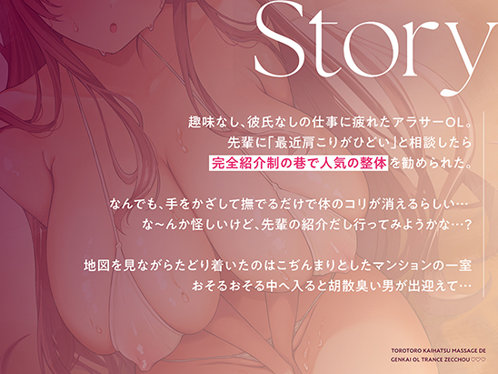 ■ストーリー 趣味なし、彼氏なしの仕事に疲れたアラサーOL。 先輩に「最近肩こりがひとい」と相談したら完全紹介制の巷で人気の整体を勧められた。 なんでも、手をかざして撫でるだけで体のコリが消えるらしい… な~んか怪しいけど、先輩の紹介だし行ってみようかな…? 地図を見ながらとどり着いたのはこぢんまりとしたマンションの一室。 おそるおそる中へ入ると胡散臭い男が出迎えて… ■トラックリスト トラック1:撫でるだけでコリが消える!?胡散臭~い整体師の怪しい施術 トラック2:絶頂ツボ押しポルチオ開発!私…ハマっちゃうかも… トラック3:栄養満点!濃厚精子ごっくんで疲れを吹っ飛ばせ! トラック4:中出しぎもじ…いいぃ!ストレス発散オホ声トランス絶頂。 トラック5:ドハマりOLの中出し懇願SEX。先生…いつものお願いします。 特典トラック ■キャスト 天知遥 ■イラスト ふじ子