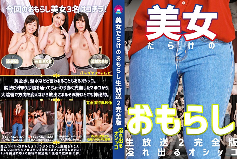 ★美女のオシッコがみたい!パンパンになった膀胱をおさえ、恥じらいながらもマコから溢れ出るオシッコを愉しみたい!そんな要望に応える番組の完全版!圧巻の放尿第2弾★黄金水、聖水などと言われることもあるオシッコ。膀胱に貯まり尿道を通ってちょぴり赤く充血したマコから大陰唇で方向を変えながら放出されるその様はとても神秘的。原美織ちゃん、涼城りおなちゃん、石川ありすちゃんの3人が大放尿を披露しました。告白中にオシッコをもらしてジーパンが変色、指でオナニー中に大量おもらし、3人同時に連れションならぬ連れおもらしなど、とにかくオシッコ好きも、そうじゃなくても必見です / 美女だらけのおもらし生放送(2)完全版~恥じらいながらも溢れ出るオシッコ